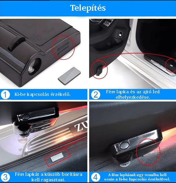 - terméken található ki-be kapcsolás érzékelővel egy vonalba fel kell ragasztani a fém lapkát a küszöbre. Amikor az érzékelő a fém lapka által takarásba kerül, akkor a led fénye elalszik